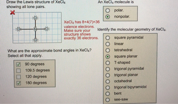 What are the approximate bond angles in xecl_4. Xecl4 electron and molecular geometry. Xecl4 lewis structure lewis dot structure for xecl4.